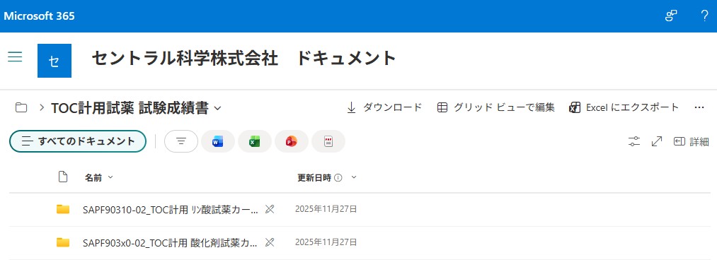 弊社、セントラル科学株式会社のSharePointサイトよりダウンロードいただけます。過去1年間分の試験成績書をダウンロード可能でございますので、ぜひご利用ください。