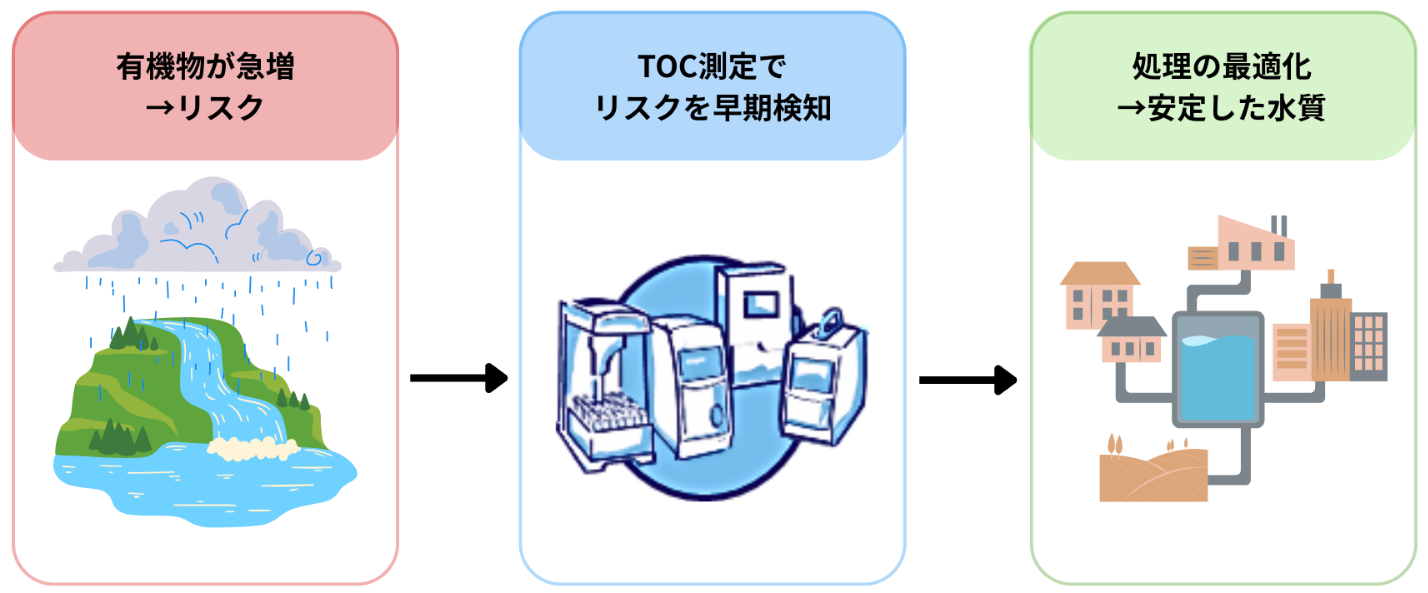 有機物が増えると、消毒副生成物の発生や処理効率の低下など、さまざまなリスクが高まります。TOC測定を行うことで、こうしたリスクを早期に察知し、浄水処理の最適化や水質の安定化につなげることができます。